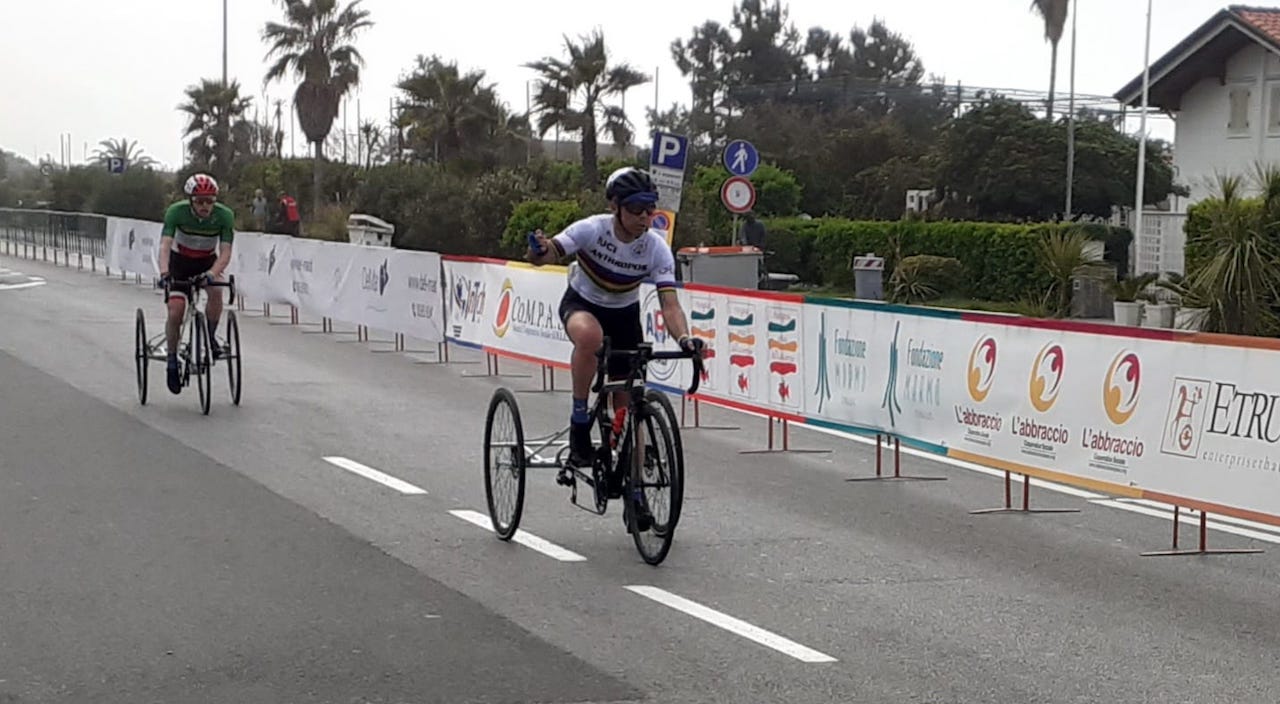 FABRIANO - Sono ricominciate le gare per il campione Giorgio Farroni. Alla due “Due Giorni del Mare”, la manifestazione internazionale di ciclismo paralimpico svoltasi sul lungomare a Marina di Massa, il fabrianese che corre per la Anthropos ha vinto sia la gara linea di 30 chilometri in 55’ 02” (sabato 9 aprile), sia la cronometro di 14 chilometri in 27’ 32” (domenica 10 aprile), quindi si è aggiudicato anche la “combinata” delle due gare nella sua categoria T1.