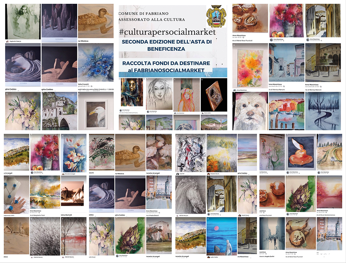 L’assessorato alla Cultura del Comune di Fabriano, di concerto con l’associazione Inarte e con la Fondazione Carifac, ha organizzato il 4 e 5 aprile un’asta di beneficienza on line (#Culturaperlemarche) per raccogliere fondi da destinare all’ospedale Engles Profili di Fabriano e alla sanità regionale per affrontare insieme l’emergenza Covid-19.??Gli artisti, fotografi, artigiani che hanno aderito concedendo il loro contributo alla raccolta fondi, hanno scelto una delle proprie opere (quadri, fotografie, disegni, manufatti artigianali) e l’hanno postata sul proprio profilo/ pagina facebook indicando l’hastag #culturaperlemarche, gestendo direttamente l’asta la cui base era di euro 30 con rilanci da euro 10. Alla prima edizione del 4-5 aprile, sono state messe all’asta 89 opere e sono stati raccolti oltre 3.500 euro, fondi dirottati per le concrete necessità dell’ospedale di Fabriano Engles Profili e della sanità regionale tramite la raccolta fondi organizzata dalla Fondazione Carifac. ??Dopo il grande successo della prima edizione, l’assessorato alla Cultura ha voluto replicare per raccogliere fondi da destinare al Market solidale di Fabriano-Associazione Quadrifoglio Onlus Fabriano Social Market che sostiene le famiglie in difficoltà durante questa emergenza Covid-19. Quindi la seconda edizione dell’asta di beneficenza (#culturapersocialmarket) è stata organizzata per il 18 e 19 aprile, con le stesse modalità della prima ma con devoluzione diversa proprio per cercare di aiutare tutti gli ambiti cittadini in difficoltà. Alla seconda edizione del 18-19 aprile, sono state messe all’asta 57 opere e le offerte si sono susseguite fino all'ultimo minuto. Siamo in attesa di vedere nei prossimi giorni il resoconto delle donazioni (al momento si sono superati i 2.000 euro). Vogliamo segnalare – dicono all’assessorato - la grande generosità di tutti gli artisti che hanno partecipato mettendo all'asta le proprie opere, alcune delle quali anche molto quotate nel mondo dell'arte: vogliamo in questa occasione ringraziare tutti i partecipanti, dalla piccola Margherita di un anno e mezzo con la sua creazione astratta a Angelo Gorlini e George Politis due grandi maestri dell'acquerello a livello internazionale a tutti i partecipanti: pittori, artigiani fotografi scultori che si sono mostrati fin dalla prima edizione pronti a rispondere a questa chiamata di solidarietà. Intanto continuano i video alla scoperta delle opere della Pinacoteca: in questa situazione di emergenza, vogliamo continuare a incontrarci e farvi compagnia sui nostri canali istituzionali e social, in attesa di tornare a visitare le strutture museali. Consultando le pagine social della pinacoteca e il sito www.pinacotecafabriano.it potrete scoprire dettagli sulle opere che si conservano in Pinacoteca e nella nostra città grazie alla partecipazione di storici dell'arte, studiosi e amici della Pinacoteca che hanno collaborato numerosi per rendere questa periodo da passare in casa un'occasione di conoscenza, come lo è ogni viaggio e ogni incontro”.