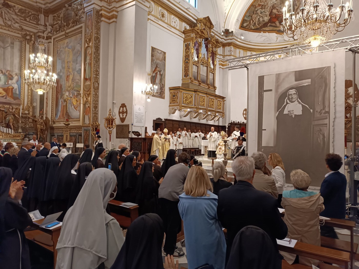 Una giornata storica per la nostra Diocesi: domenica 9 ottobre 2022 Maria Costanza Panas è proclamata Beata. Solenne concelebrazione presso la Cattedrale di Fabriano, presieduta dal Card. Marcello Semeraro, Prefetto del Dicastero delle Cause dei Santi, alla presenza del Vescovo della Diocesi di Fabriano-Matelica Mons. Francesco Massara, del Vescovo emerito Mons. Giancarlo Vecerrica e del Card. Edoardo Menichelli. Il servizio liturgico è stato svolto dal Seminario di Ancona e dalla Fraternità Missionaria di Cristo Crocifisso dell’America Latina, i canti sono stati curati dalla corale S. Cecilia e dalla cappella musicale della Cattedrale fabrianese diretta dal maestro Paolo Devito. Ben 60 le suore cappuccine provenienti da tutto il mondo che hanno preso parte alla concelebrazione con l’abbadessa del monastero fabrianese Suor Michela Letizia Argiolas che ha espresso, visibilmente commossa, parole di ringraziamento per questa memorabile giornata, riprendendo le parole della Beata Costanza che ha sempre invitato ad avere coraggio “perché le tribolazioni e le difficoltà non sono l’ultima parola”. Un grazie sentito anche da parte del Vescovo Massara che ha augurato a tutti che “la penna di Costanza diventi per ognuno di noi una penna di Dio”. Il Card. Semeraro ha fatto riferimento nella sua omelia agli scritti e appunto alla penna di Maria Costanza: “In un manoscritto del 1936 – ha detto – intitolato ‘La Santa Messa’ ella ne parla come il racconto dell’infinita bontà del Padre celeste per le sue povere creature e noi per compensarlo dobbiamo fare della nostra vita una continua imitazione della Messa”. Infine è stato ricordato che questa mattina nell’Angelus il Papa al termine della S. Messa celebrata sul sagrato della Basilica di S. Pietro, ha ‘anticipato’ questa celebrazione solenne, dicendo che “a Fabriano – sono parole di Papa Francesco - verrà beatificata Maria Costanza Panas, monaca clarissa cappuccina, vissuta nel Monastero di Fabriano dal 1917 al 1963, quando partì per il Cielo. Accoglieva quanti bussavano al monastero infondendo in tutti serenità e fiducia. Negli ultimi anni, gravemente inferma, offrì le sue sofferenze per il Concilio Vaticano II, di cui ricorre dopodomani il 60° di apertura. La Beata Maria Costanza ci aiuti ad essere sempre fiduciosi in Dio e accoglienti verso il prossimo. Un applauso alla nuova Beata!”.
