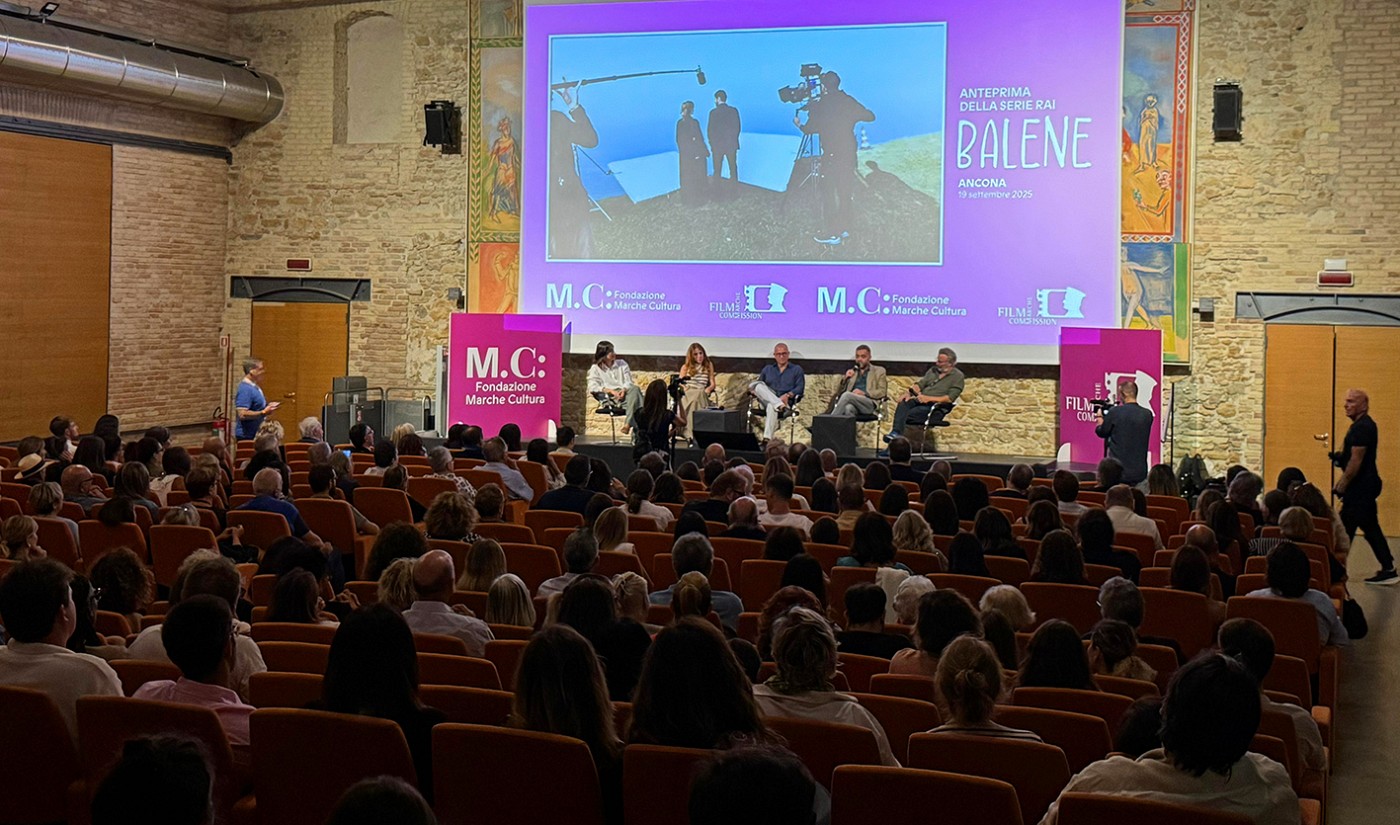Grande successo per la proiezione in anteprima nazionale della prima puntata della nuova serie Tv Balene girata tutta nelle Marche, centinaia di spettatori hanno accolto calorosamente il cast all’auditorium della Mole Vanvitelliana di Ancona e si sono lasciati trasportare dalla magia della prima appassionante puntata che ha regalato gli straordinari scenari della città di Ancona e della località di Portonovo. La serie, tratta dal romanzo omonimo di Barbara Cappi e Grazia Giardiello, coprodotta da Rai Fiction e Fastfilm Srl è stata realizzata con il contributo di Regione Marche PR-FESR 2021-2027, Fondazione Marche Cultura e Marche Film Commission in quanto vincitrice del bando cinema 2024. Diretta da Alessandro Casale, Balene vede nel cast degli attori principali: Veronica Pivetti, Carla Signoris, Giorgio Tirabassi, Paolo Sassanelli, Laura Adriani e Filippo Scicchitano. L’anteprima ha riscosso un grande successo, con un pubblico entusiasta che ha partecipato all’ incontro esclusivo, moderato dal Presidente della Fondazione Marche Cultura - Marche Film Commission, Andrea Agostini con il produttore Massimo Rocchi, il regista Alessandro Casale e gli attori Laura Adriani, Paolo Sassanelli e Valentina Pastore di Fano. Il talk si è aperto con il video saluto al pubblico di Ancona delle due attrici principali di Balene, Veronica Pivetti e Carla Signoris non presenti alla proiezione in quanto impegnate nella promozione della serie nelle trasmissioni televisive Rai. “Mi dispiace non essere presente alla proiezione per me e stato un grande regalo lavorare nella vostra regione ho conosciuto tante persone e mangiato cose buonissime - ha detto Carla Signoris - godetevi la serie, racconta bene le Marche di cui dovete essere orgogliosi è una terra meravigliosa!“. “Ancona per me è ormai una mezza casa, mi è diventata familiare, sono stati tutti molto accoglienti con noi e aprire gli occhi la mattina su quel bel mare non è cosa da poco, per non parlare dei comuni vicini, luoghi che sembrano finti per quanto sono belli. – Ha aggiunto Veronica Pivetti - Balene è una gran bella serie televisiva ed il merito è tutto vostro spero ci accoglierete anche per la seconda serie.. ma intanto godiamoci la prima”. Veronica Pivetti (Evelina) e Carla Signoris (Milla) sono le protagoniste di questo dramedy brillante e originale in cui due amiche scelgono di fare dei loro sessant’anni un nuovo inizio. Evelina e Milla che si conoscono fin dai tempi dell’università, da dieci anni non si frequentano più ma la scomparsa di Adriana, terza amica di sempre, riavvicina le due donne, accomunate dalla necessità di un grande cambiamento nelle proprie vite. Sempre più convinte che dietro l’incidente in mare di Adriana si nascondano dei misteri da portare alla luce, riscopriranno la loro amicizia e che non è mai troppo tardi per essere felici. “Girare nelle Marche è stata una scelta mirata, ci serviva una bella ambientazione marina con caratteristiche accattivanti – ha spiegato il regista Alessandro Casale - la storia si muove principalmente tra Ancona e il Conero, il luogo ideale per girare questa serie, ma ho avuto l’occasione di conoscere bene anche l’entroterra dove poter raccontare tante altre bellissime storie” L’attore Paolo Sassanelli interpreta nella serie il ruolo di Walter il marito di Milla: “le Marche sono bellissime, le colline sono un vero patrimonio dell’umanità e in ogni paesino c’è un gioiello che è un teatro; è una regione tutta da scoprire un posto dove la vita è dolce e dove ho sentito il calore di casa”. Laura Adriani nella parte di Flaminia è la figlia di Walter e Milla: “sono rimasta incantata dalla bellissima luce di questa terra che non ha nulla da invidiare alle piu blasonate regioni d’Italia come la Toscana; Ancona mi ha accolto benissimo speriamo di fare presto la seconda stagione” L’attrice di Fano Valentina Pastore riveste il ruolo di Susanna: “È stato un privilegio lavorare nella mia terra, poter tornare ogni sera a casa è stato fantastico. Grazie al lavoro magistrale della Marche Film Commission c’è stato uno spostamento di attenzione da Roma verso la nostra Regione e questo mi riempie di gioia e di soddisfazione”. Il Presidente di Fondazione Marche Cultura Marche Film Commission Andrea Agostini ha ribadito l’importanza di Balene come grande vetrina di promozione turistica su Rai1, ricordando che in soli due anni e mezzo sono state prodotte nella regione ben 70 opere in sinergia con tutta la rete creata nelle Marche, specie comuni e associazioni di categoria, tutti sempre più consapevoli dell’importante ricaduta economica che l’audiovisivo porta nel territorio e delle straordinarie opportunità di promozione dei nostri luoghi in Italia e all’estero Nella serie tv, composta da otto episodi che andranno in onda su Rai1, in quattro serate a partire dalla scorsa domenica 21 settembre, fanno da scenografia alla trama: il centro storico e il porto di Ancona, la strada panoramica del Conero, la località di Portonovo e le città di Osimo, Sirolo, Jesi e Falconara Marittima. Balene è stata girata nel territorio in quattro mesi, da ottobre 2024 a febbraio 2025, ed ha coinvolto nella produzione ben 47 maestranze marchigiane su 135 membri della troupe e centinaia di figurazioni e comparse locali.