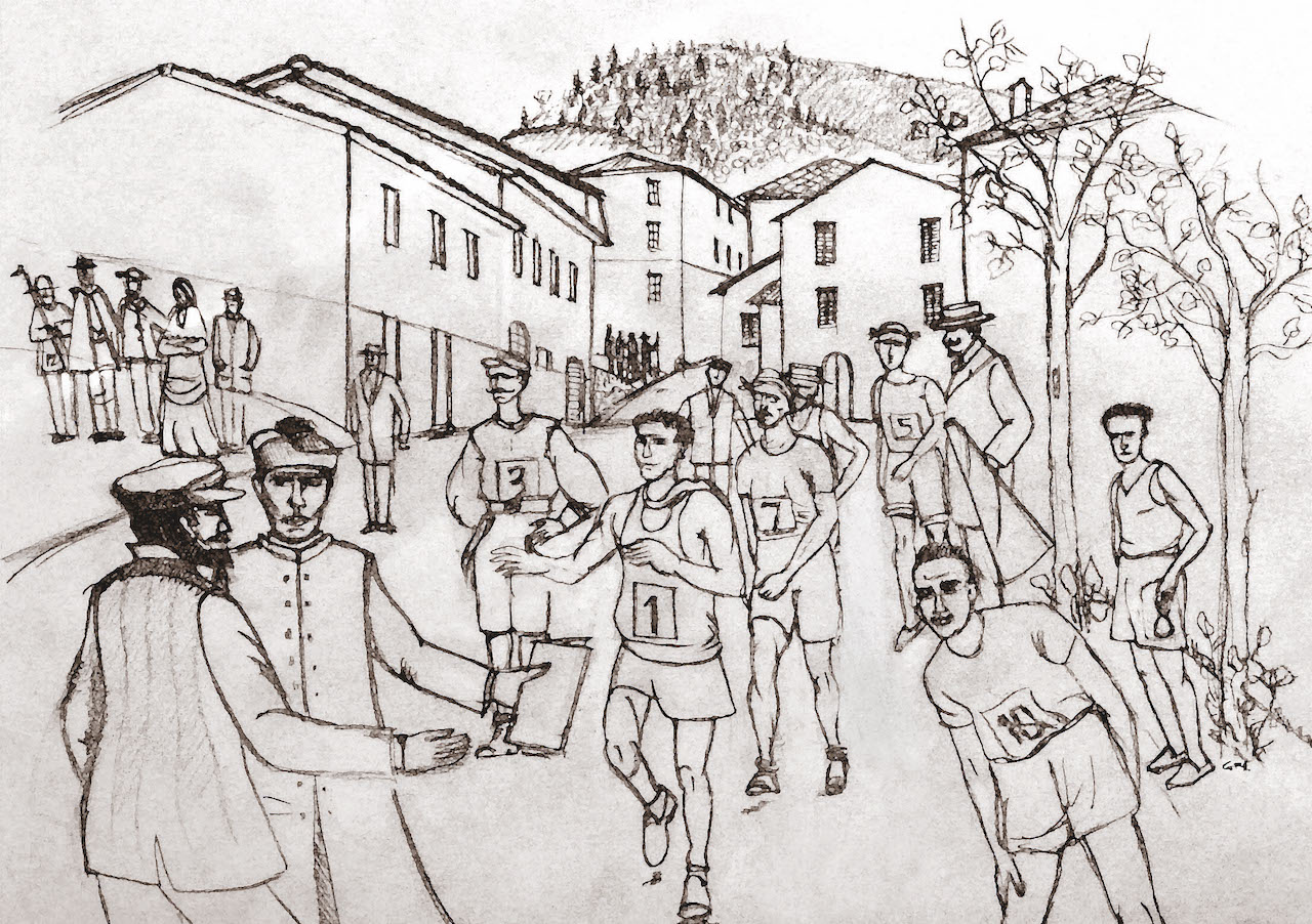 La preparazione per la partenza della gara podistica di Marischio del 20 ottobre 1912 (ricostruzione ideale di Grazia Cocco)