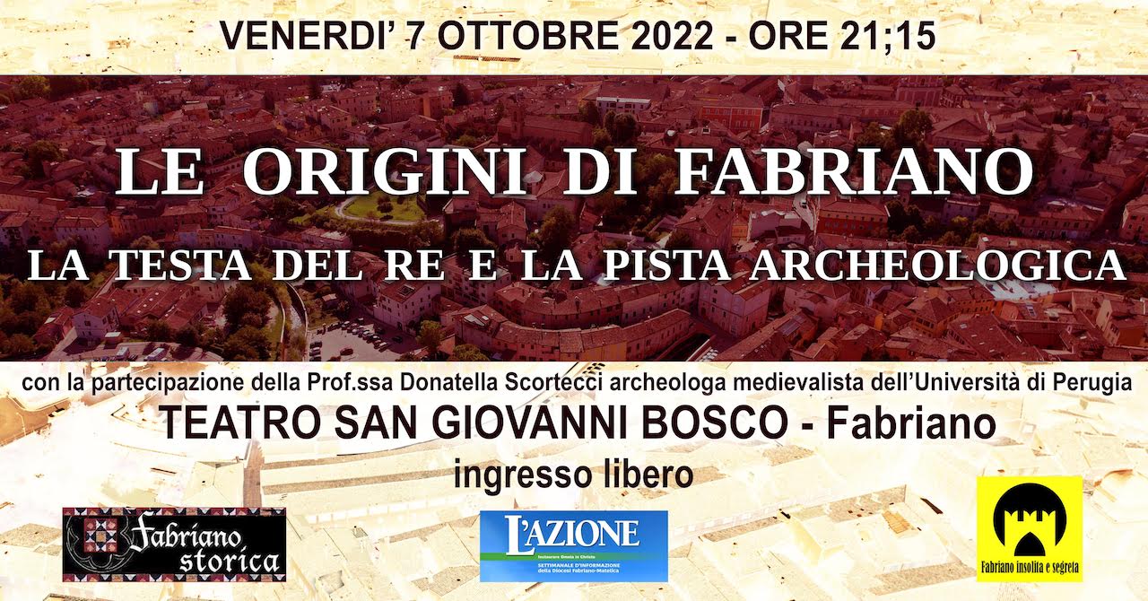 FABRIANO - Cosa sappiamo della nascita dei due castelli che diedero origine a Fabriano? Nuovi enigmatici reperti riemergono oggi dal passato di quei secoli oscuri, dei quali sappiamo molto poco. Ma forse non tutto è perduto: le conoscenze degli esperti e l’indagine archeologica possono venirci in soccorso per fare finalmente luce su quando e da chi fu fondata la città; questi gli intriganti temi che verranno trattati nella serata di venerdì 7 ottobre alle ore 21.15 presso il teatro San Giovanni Bosco di Fabriano. L’evento, intitolato “Le origini di Fabriano - La testa del Re e la pista archeologica”, nato dalla consolidata collaborazione fra il settimanale "L’Azione" e l’associazione culturale Fabriano Storica, vedrà la proiezione di inediti contributi video ai quali si alterneranno interventi di appassionati ed esperti. Sarà ospite della serata la professoressa Donatella Scortecci, archeologa, medievalista e docente dell’Università di Perugia, che proporrà un puntuale approfondimento sui possibili scenari storici che portarono alla fondazione di Fabriano.