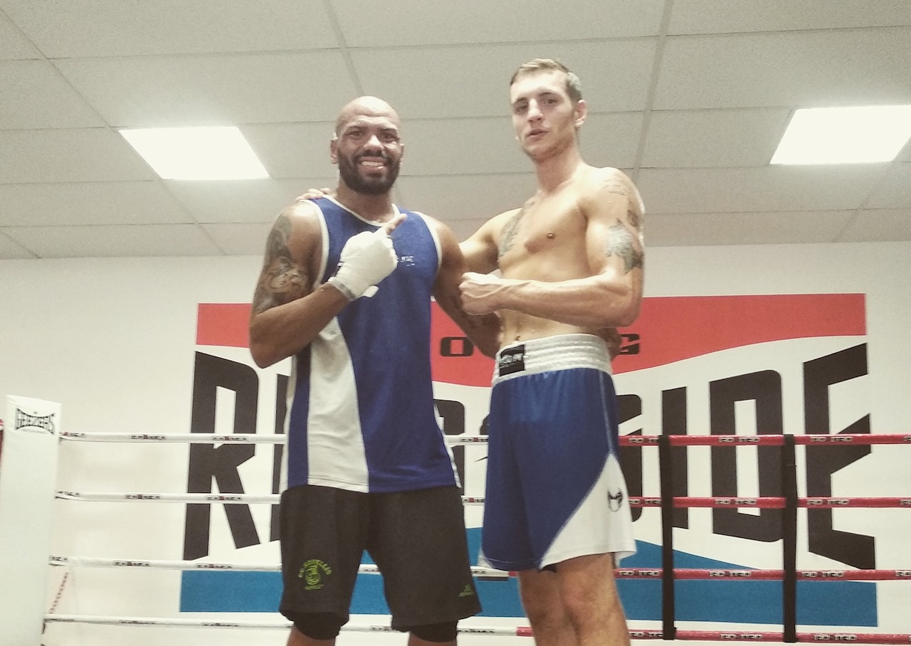 Federico Stroppa (a destra) con il campione Valentino Manfredonia la settimana scorsa sul Ring Side Boxe Club di Rimini