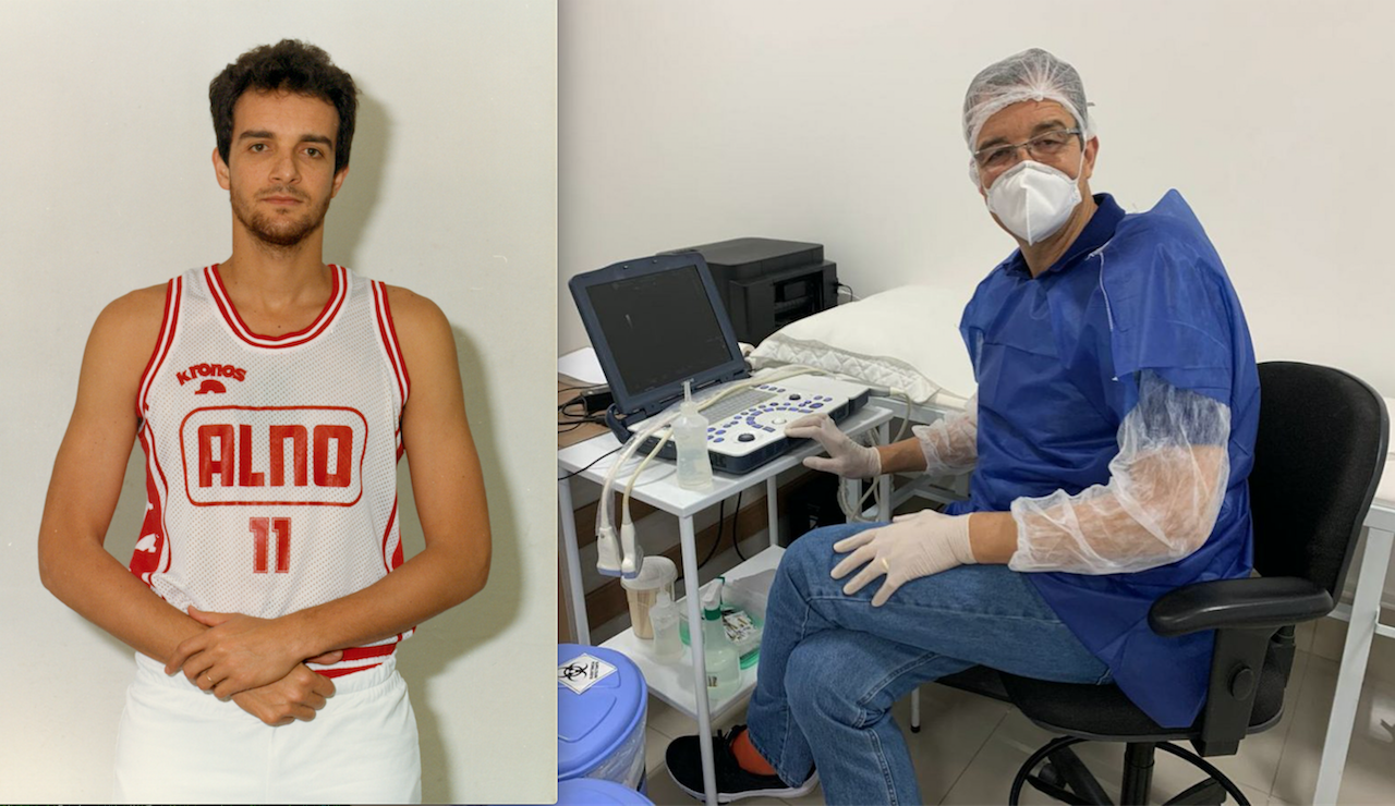 A sinistra Marcel con la maglia dell'Alno Fabriano alla fine degli anni Ottanta e a destra ora mentre esegue una ecografia