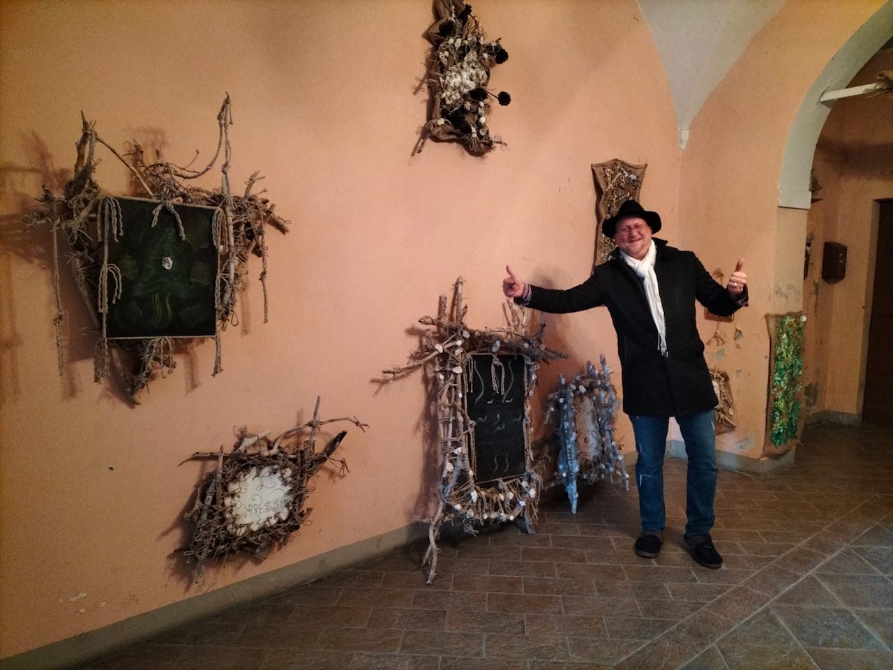 FABRIANO - Fabrianese, personaggio poliedrico se ce n’è uno, Massimo Pocognoli si sta distinguendo anche a livello artistico con le sue particolari creazioni. Già cabarettista, giocatore di boccette, collezionista d’auto d’epoca e molto altro… il popolare, eccentrico e simpaticissimo “Massimetto” ora mostra un lato finora nascosto della sua personalità, legato all’arte. «Tutto è partito dalla scrittura – ci racconta Pocognoli: - sono un tipo sempre allegro e scherzoso, ma a volte divento serio e scrivo pensieri. Attraverso la pittura inizialmente a olio, poi, ho cercato di seguire lo stesso segno di quando scrivo, è il pennello che mi guida e aiuta ad esprimere me stesso». La sua attività artistica si è poi evoluta in vere e proprie creazioni, con cui ha addobbato l’atrio del palazzo in centro storico dove abita. «Andando al mare – racconta – sono stato colpito da quei pezzi di legno sbiancati dal mare e dal sole che restano depositati sulla spiaggia, essiccati. Ho pensato di utilizzarli, tenendoli uniti con gli spaghi che hanno lo stesso colore, talvolta arricchisco con delle conchiglie: sono opere dedicate al mare».