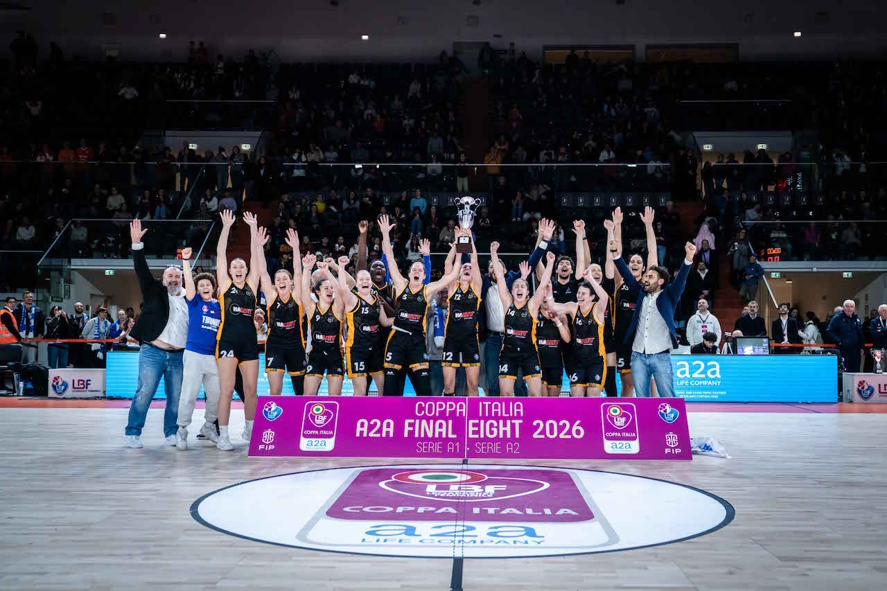 La cronaca. Partenza a razzo dell’Alpo, dicevamo, grazie alle iniziative di Alice Gregori (0-5 al 2’). Matelica non si scompone, si appoggia all’esperienza di Elena Pilakouta e Benedetta Gramaccioni per rispondere con un break di 11-0 che restituisce la giusta tranquillità alle marchigiane (11-5 al 5’). La Thunder continua a rifornire sotto canestro la prestante Pilakouta (chiuderà con 8/10 al tiro da due e il titolo di “mvp” di serata) e la forbice si allarga ancora (17-7 al 9’) per andare al riposo sul 17-8. Il secondo quarto si apre con il +11 matelicese (22-11 al 12’) grazie alle scorribande di Gloria Offor e ai tanti rimbalzi in attacco che la giovane matelicese cattura (e prenderà nel resto della gara, ben 7 alla fine). L’Alpo, però, ricorrendo a sprazzi di zona, si desta e in attacco centra una serie di triple che la riavvicinano (25-21 al 14’). L’andamento a elastico dell’incontro torna a premiare Matelica che, grazie ancora a Offor, arriva all’intervallo lungo sul punteggio di 38-29. In uscita dagli spogliatoi l’Alpo è ben agguerrita, tanto che Carlotta Rainis e Francesca Parmesani accorciano di nuovo sul 38-33 al 21’. Nel momento forse più complicato del terzo quarto, la Thunder però non sbanda e ha la lucidità per affidarsi alle mani sicure di Chiara Bacchini, Alessia Cabrini e ancora dell’infallibile Elena Pilakouta per toccare il massimo vantaggio di +12 al 28’ (47-35). Si va all’ultimo mini riposo sul punteggio di 50-41. La scatenata veneta Francesca Parmesani approfitta di qualche palla persa di troppo da parte della Thunder per riaprire l’incontro all’inizio dell’ultimo quarto (50-45 al 31’). Calano le percentuali al tiro matelicesi e l’Alpo arriva a un solo possesso di distanza (53-50 al 33’). E’ un momento topico e rischioso, ma Matelica regge e per tre minuti riesce a fermare l’attacco avversario, riprendendo quota con Gramaccioni e Cabrini (58-50 al 36’). La Thunder inizia a vedere il traguardo, ma ancora Parmesani con un gioco da tre punti rimette il risultato in discussione (60-56 al 38’). Servono ancora Pilakouta e la quarta tripla di serata di Cabrini per poter alzare – finalmente – le braccia al cielo sul 65-56 del 39’. Dalla lunetta Chiara Bacchini, indiscussa protagonista di questa Final Eight con 20,0 punti e 8,3 rimbalzi di media nelle tre partite, sigilla il punteggio sul 67-56 conclusivo. La Coppa Italia 2026 è della Thunder: possono partire i festeggiamenti, la gioia e le lacrime per un successo storico conquistato dalla “piccola-grande” Matelica.