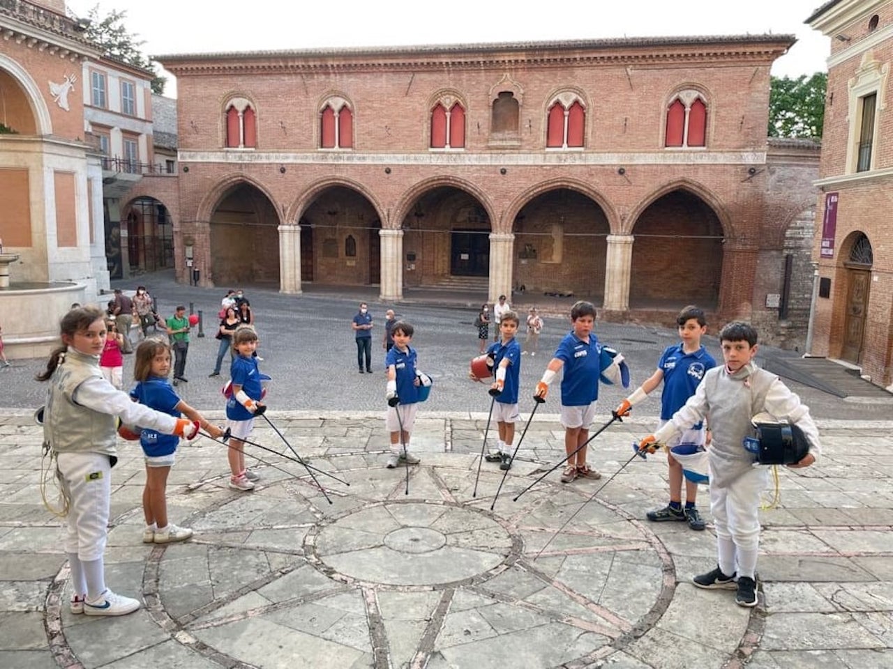 FABRIANO - La Piazza della Cattedrale di Fabriano ha ospitato la “chiusura” della stagione della scherma fabrianese. Il 23 e il 28 giugno, gli Esordienti e le Prime Lame si sono ritrovati sul “palcoscenico naturale” della basilica di San Venanzio per salutarsi e salutare il pubblico di parenti e passanti. La vetrina è stata importante e per loro si è trattato quasi… di un’Olimpiade! Si leggevano l'emozione, la gioia, l'impegno nei loro visi, emozioni presto scomparse sotto le maschere per gli ultimi assalti della stagione. Che bello spettacolo la scherma in centro storico! Grazie a Don Antonio Esposito per l’ospitalità.