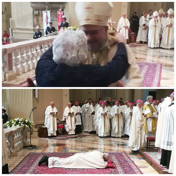 Vi voglio già bene”, l’ultima espressione in chiesa dopo qualche nota cantata di “Romagna mia” per mandare… in visibilio la solenne Cattedrale di S. Cassiano di Imola. Don Giovanni Mosciatti si è presentato così alla prima benedizione da Vescovo della città romagnola con mitra, pastorale ed un entusiasmo che ha contagiato tutti. Davvero tutti. Ed erano in tanti. Non solo i cinque pullman annunciati dalla Diocesi (con tanto di autorità civili, dai sindaci di Fabriano Santarelli, di Matelica Baldini, di Sassoferrato Greci, del vice sindaco di Genga Bruffa), ma almeno cinquanta auto ed una serie di pulmini provenienti da Marche ed Umbria. Almeno 700. Poi i fedeli di Imola, sinceramente increduli e stupiti, ma commossi per l’empatia e l’umanità del sacerdote di S. Facondino, la parrocchia di Sassoferrato. “Ma lui è sempre così?”. Non nascondo che tanti imolesi, soprattutto dopo la performance sul prato della Rocca Sforzesca per la festa post ordinazione, mi hanno rivolto questa domanda. E forse hanno trovato una conferma sulle magliette che i suoi amici del gruppo musicale “Turno di guardia” avevano fatto stampare per l’occasione “La nostra… Eccellenza”. Don Giovanni Mosciatti è proprio così, “un’eccellenza” semplice, attento a cogliere le sfumature della vita, la grandezza del gesto in Cattedrale con tutta la coscienza e la responsabilità richieste, ma anche il coraggio di mettere la faccia nell’ambito… ricreativo, trasformandosi in anchorman, in istrione del palco, ghermendo la tromba e spiazzando con i suoi assoli vocali e strumentali. Lui, guida di un popolo che lo stava divorando con gli occhi, mestierante della musica, incitava il pubblico a cantare, seguendo le note del pezzo, mentre su Imola cadevano le prime ombre della notte. E la gente a poco a poco ritornava, faticando non poco, alle proprie case, affamata di una Chiesa prossima all’uomo, capace di dialogare in piazza con i linguaggi della modernità sena fare sconti, senza scendere a compromessi, ma chinandosi, come ha fatto don Giovanni al momento dell’ordinazione, alle pieghe di un disegno più grande. E se ne era accorto anche quel grande pastore che è Mons. Zuppi, Arcivescovo di Bologna, nell’omelia in Cattedrale: “La gioia di oggi è tutta grazia, tanto più grande del nostro peccato e della mediocrità della nostra vita. Come tutti i doni diventano nostri se li doniamo, se vinciamo l’istintivo senso di possesso che ci fa credere che c’è più gioia nel ricevere che nel dare. La tua gioia, Giovanni, è anche la nostra, dei tuoi e di tutti quei tuoi, tanti e cari, che Dio ti ha fatto incontrare in questi anni, carovana affidabile del tuo cammino”. Da buon padre che si rivolge ad un figlio destinato ad un altro luogo, non lesina consigli e carezze: “Il buon umore non ti manca e ti tiene lontano dal sussiego altero che non avvicina e sconsiglia di avvicinarsi. Sei un padre e non un paternalista che ripete consigli lontani e istruzioni per l’uso ma non li vive con loro…”. L’ascolto è intenso, le parole pesanti per la portata, dolci per il rimando ad un’esperienza di amore e di abbraccio. Poi S. Agostino… “Niente dimostra tanto bene l’amicizia quanto il portare il peso dell’amico, perché quando si ama, non si fatica, o se si fatica, questa stessa fatica è amata”. Dopo le parole dell’arcivescovo concelebrante (al suo fianco anche l’emerito di Imola Tommaso Ghirelli e l’amministratore apostolico di Fabriano-Matelica Stefano Russo) l’attesa ordinazione con l’unzione crismale, la consegna del libro dei Vangeli, quella dell’anello, la mitra, il pastorale e quindi l’insediamento. A questo punto don Giovanni è sull’altare: è Vescovo. I confratelli, sono ben 18, si avvicinano a lui e lo abbracciano: commovente la stretta con l’emerito di Fabriano-Matelica Giancarlo Vecerrica, un padre, un costante pungolo, un’esperienza condivisa e vissuta all’unisono, poi la commozione più forte con l’infinito abbraccio con la madre Marisa. Applausi scroscianti, non sembra nemmeno di stare in una chiesa, ma sono battiti composti, perché partono dal cuore e non da un mero impulso istintivo. Quegli stessi applausi che poi lui va a ricevere su un altro altare, quello profano della Rocca, tra giovani in delirio e quei jingle un po’ rock ma anche un po’ melodiosi che da questo 13 luglio hanno reso la nostra Diocesi più vicina a quella di Imola.